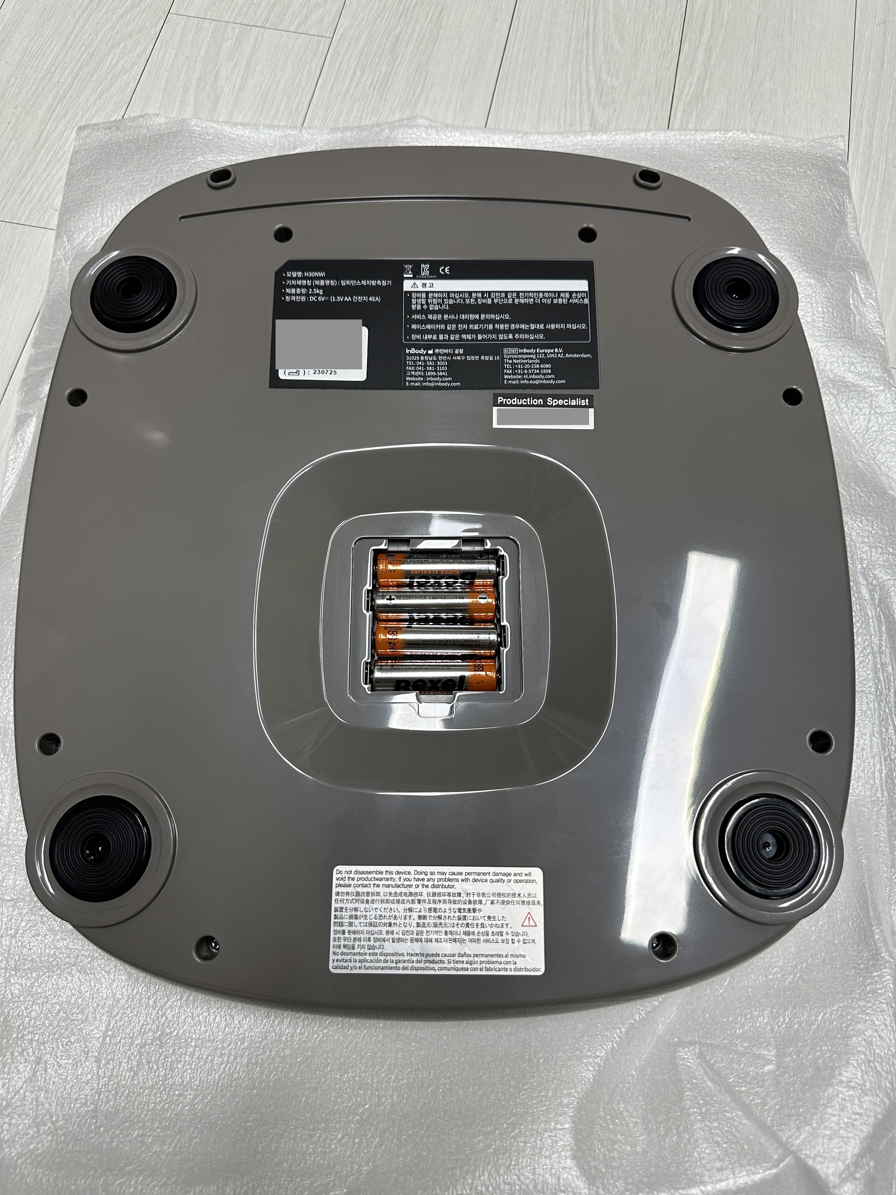 체중계 아래쪽에 제조일자, 시리얼넘버 그리고 체중계 제조를 담당한 사람이름도 확인이 가능함. 품질에 자신이 있어서 그런 게 아닐까 하는 생각이 들었다.