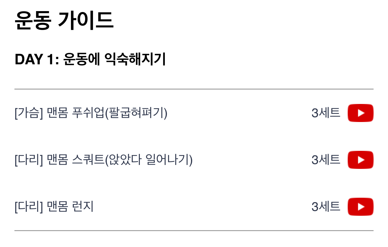 운동 가이드는 인바디에서 제작한 게 아니라 기존 유튜브 채널에 있는 영상을 링크하여 보여주는 점 참고.