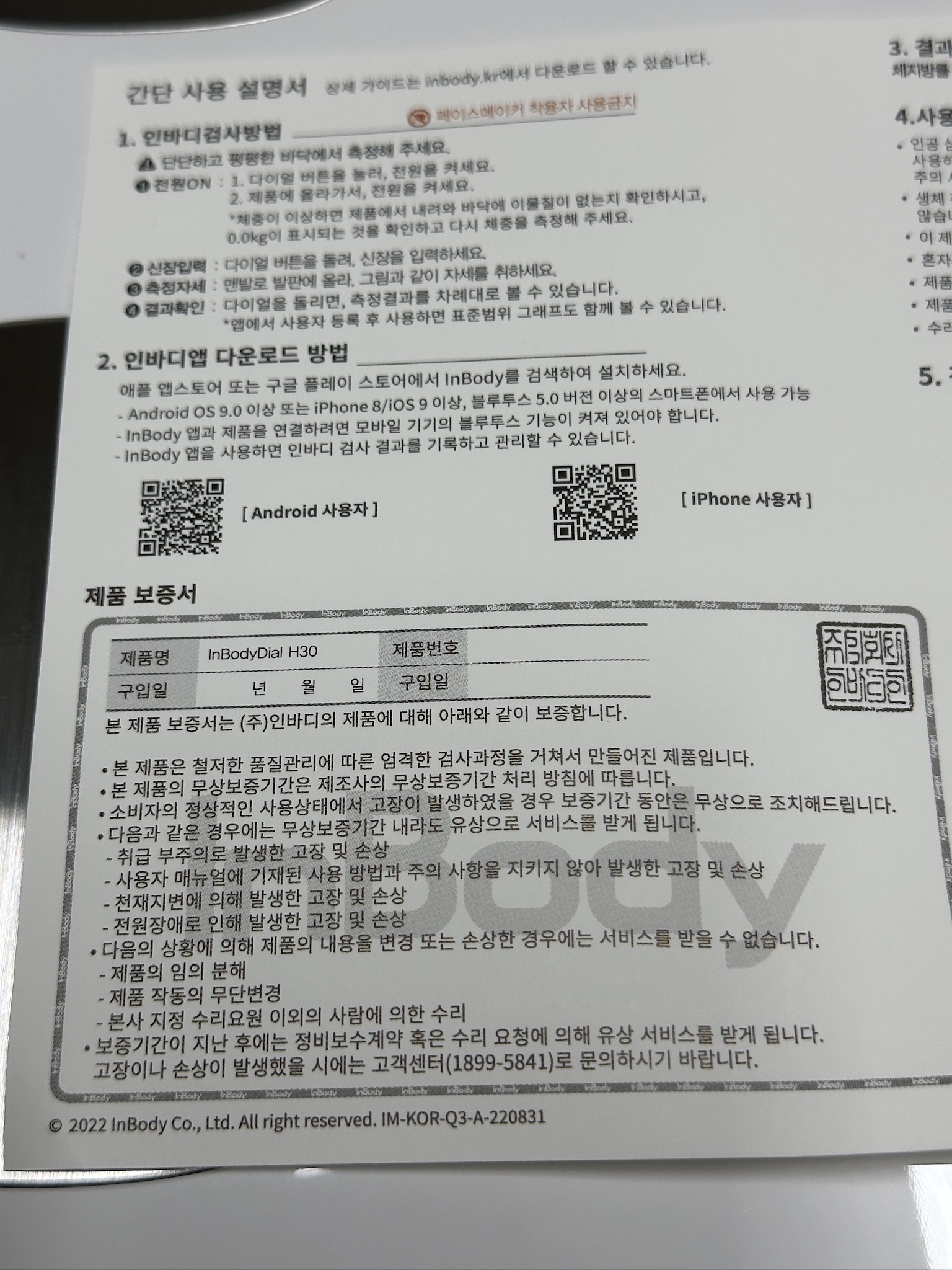 동봉된 사용설명서를 확인하면 간단한 사용방법과 QR코드를 이용하여 인바디 앱을 다운로드 가능함.