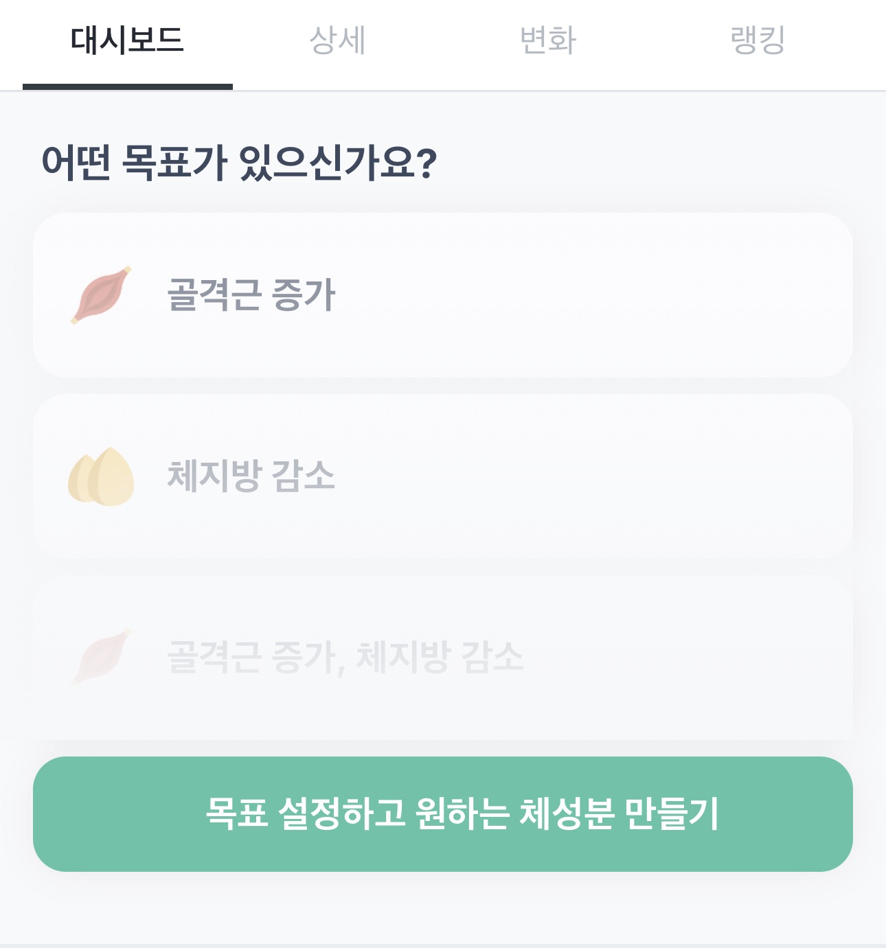 엡에 대시보드에서 본인의 목표설정을 하면 식단 및 운동 가이드를 제시한다.